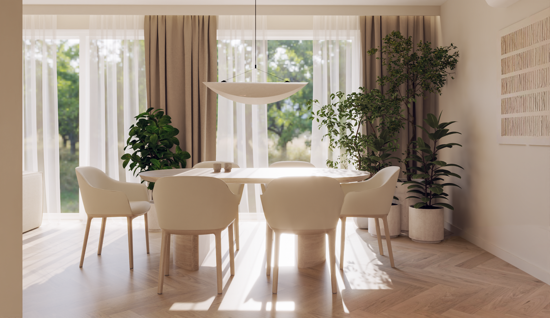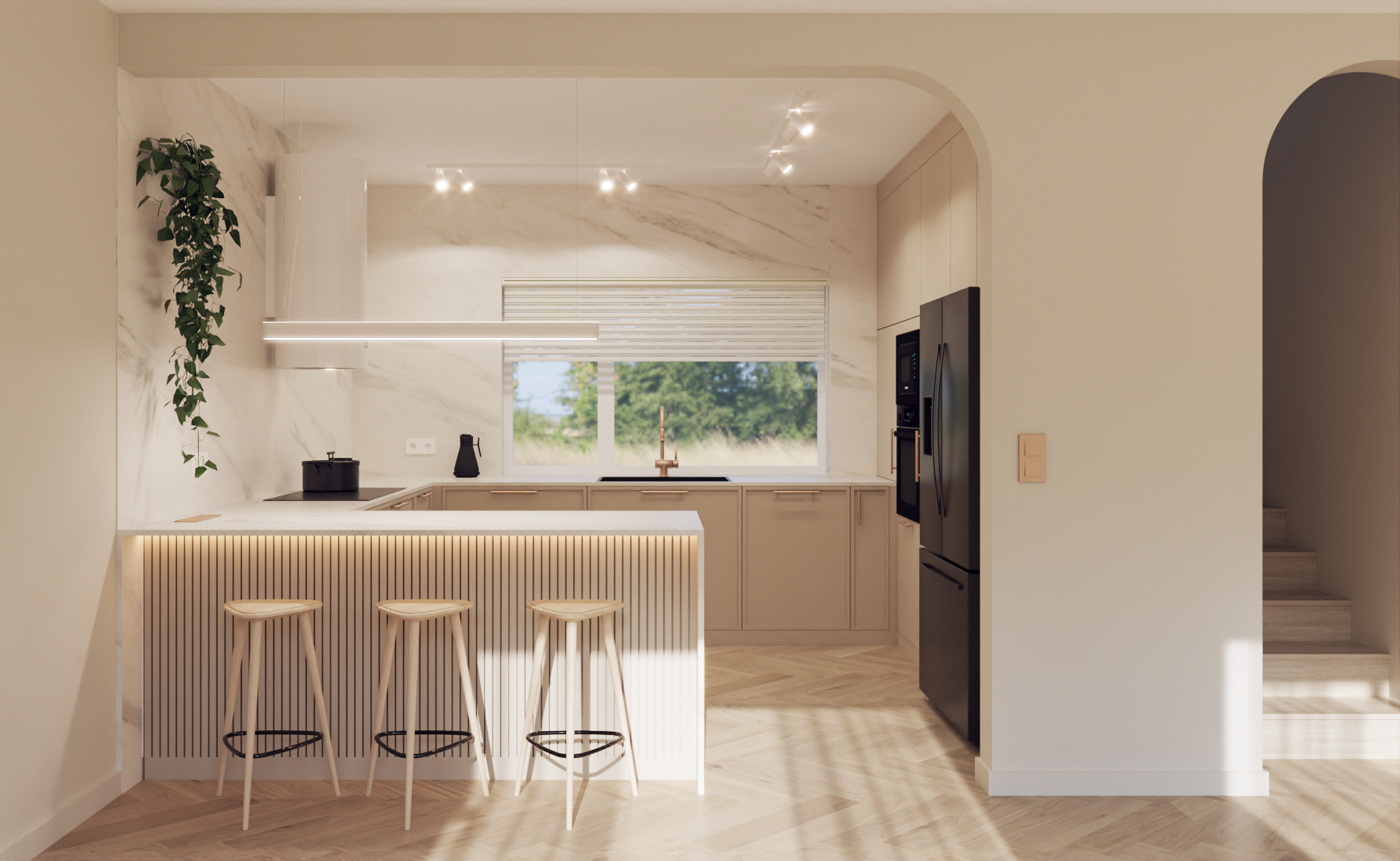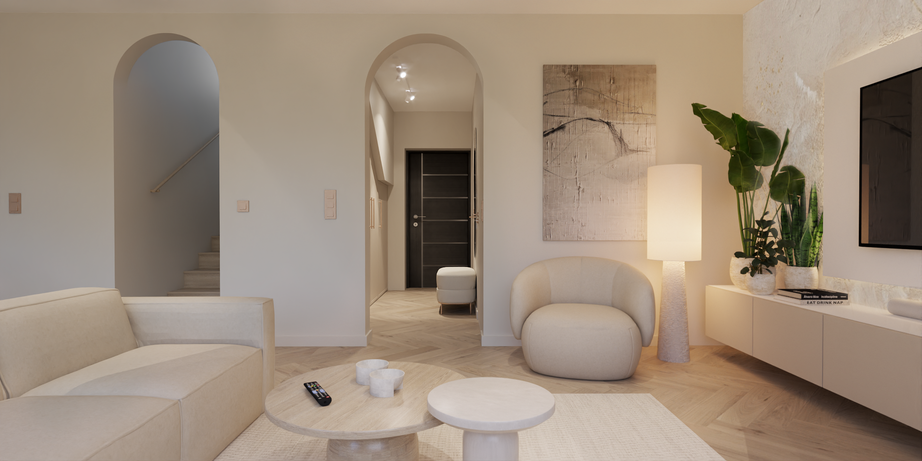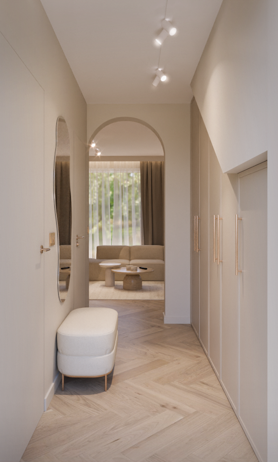 Projekt utrzymany w estetyce modern soft minimalism, łączący naturalne światło, stonowaną kolorystykę, miękkie formy i dużą ilość zieleni. Priorytetem było stworzenie otwartej, „niezagraconej” przestrzeni – pełnej światła, przytulnej i zarazem minimalistycznej.