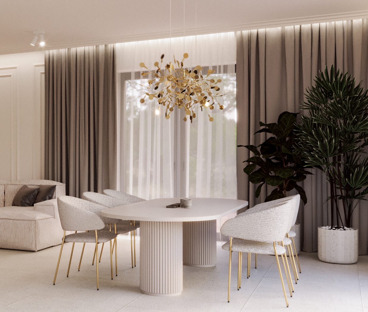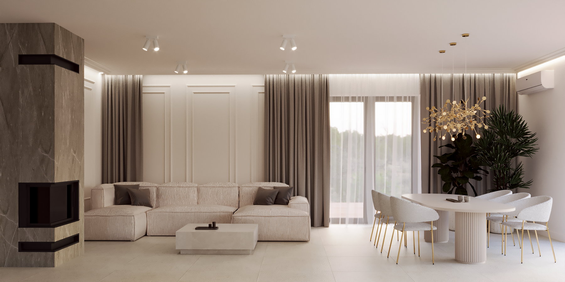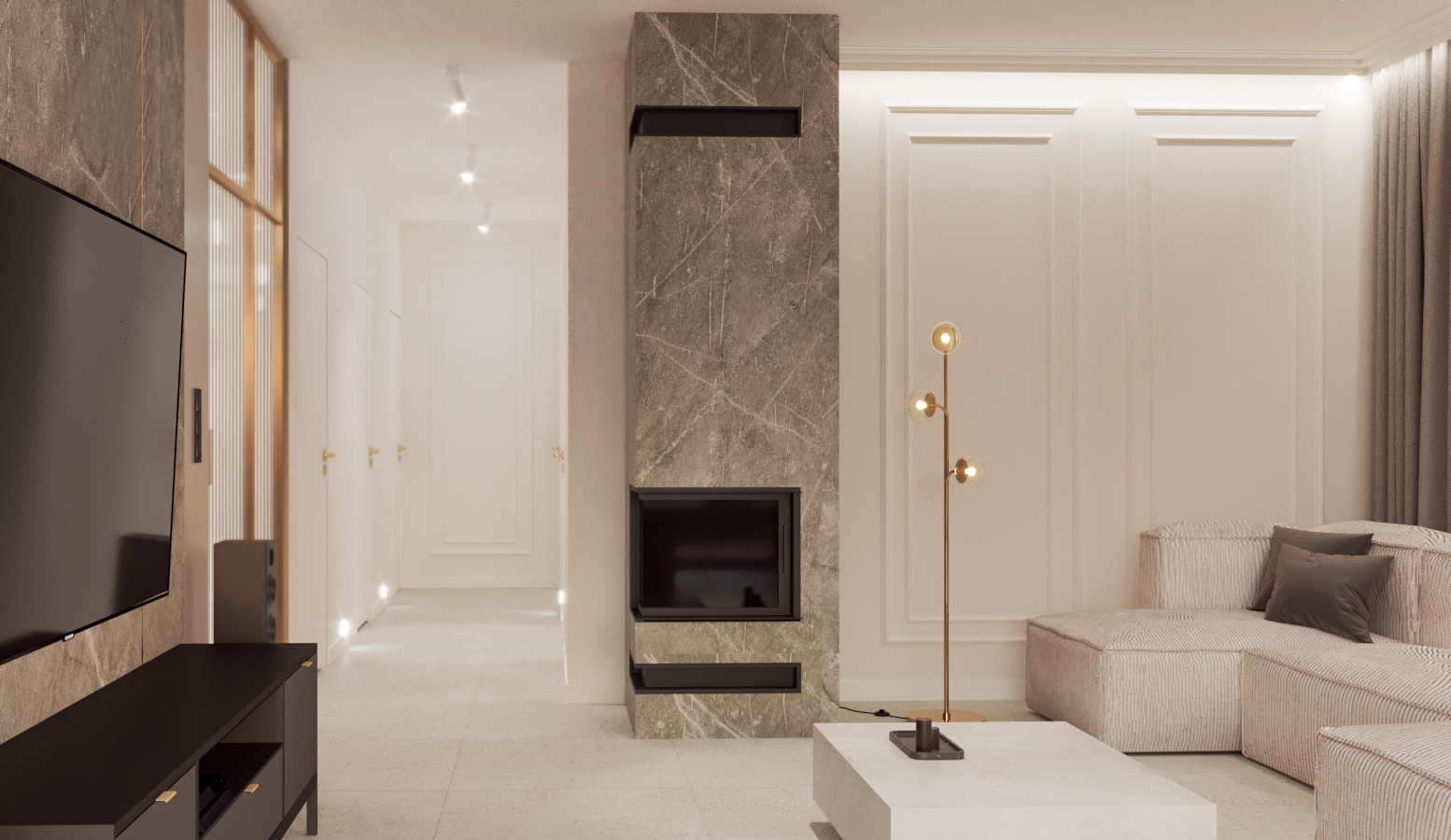 Dominują beże, szarości i złote akcenty, które w połączeniu z naturalnym światłem tworzą atmosferę subtelnego luksusu.