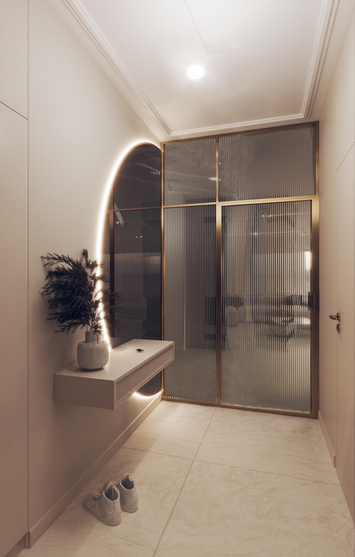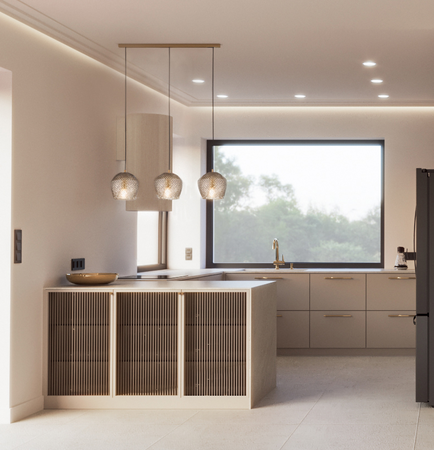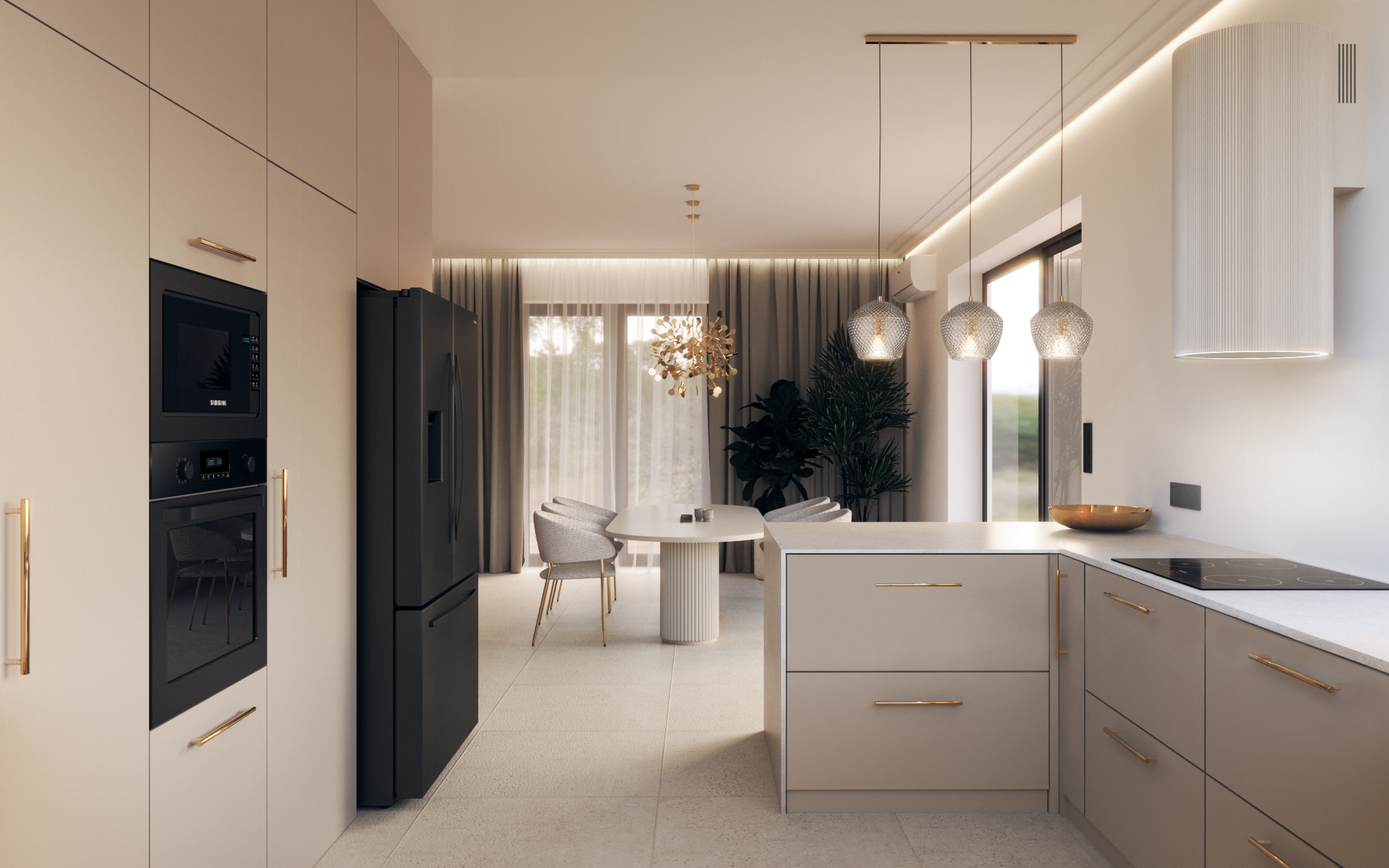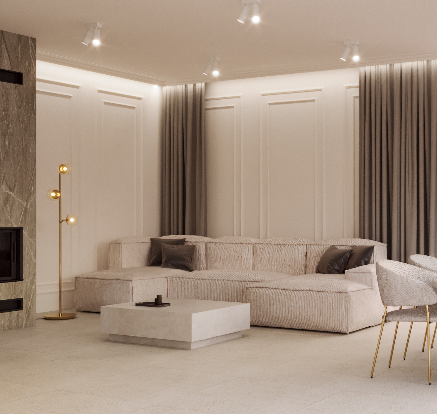 Dominują beże, szarości i złote akcenty, które w połączeniu z naturalnym światłem tworzą atmosferę subtelnego luksusu.